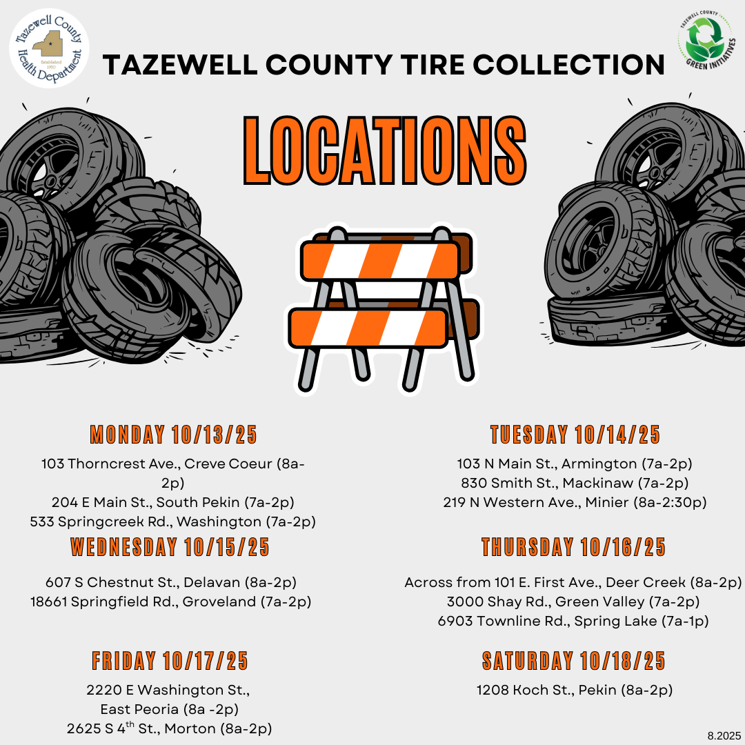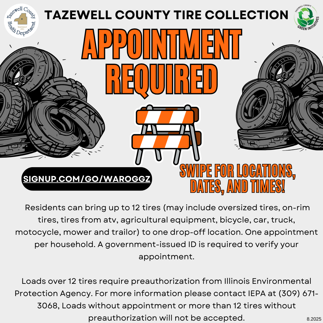 Tazewell County is hosting a free tire collection at multiple locations throughout the county the week of October 13th-18th. Appointment is required to attend, and you may only sign up for one time slot per household. Residents can bring up to 12 tires (on the rim and any size) to one of thirteen convenient drop-off locations. This event is for residents only; tires from commercial entities will not be accepted. A government-issued ID is required to verify your appointment. This event is made possible through a partnership with local municipalities and the IEPA. Waste tires left outside can collect water, creating breeding grounds for mosquitoes. One scrap tire can lead to the breeding of thousands of mosquitoes over a single season. Removing these tires helps reduce the risk of mosquito-borne illnesses.